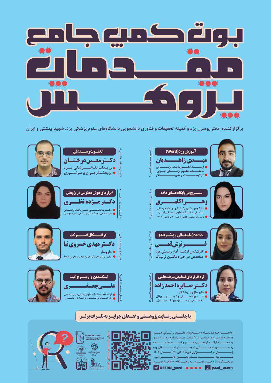 دفتر یوسرن دانشگاه علوم پزشکی یزد با همکاری کمیته های تحقیقات و فناوری دانشجویی دانشگاه های علوم پزشکی یزد، شهید بهشتی، و ایران برگزار می کند: