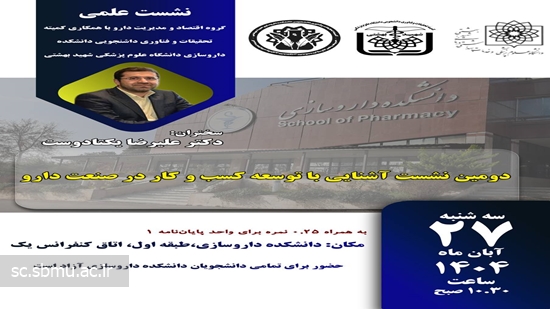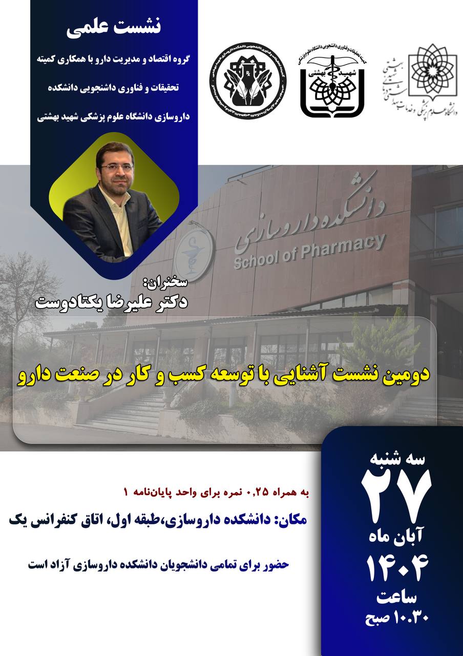 ▫️گروه اقتصاد و مدیریت دارو با همکاری کمیته تحقیقات و فناوری دانشجویی دانشکده داروسازی شهید بهشتی برگزار میکند: