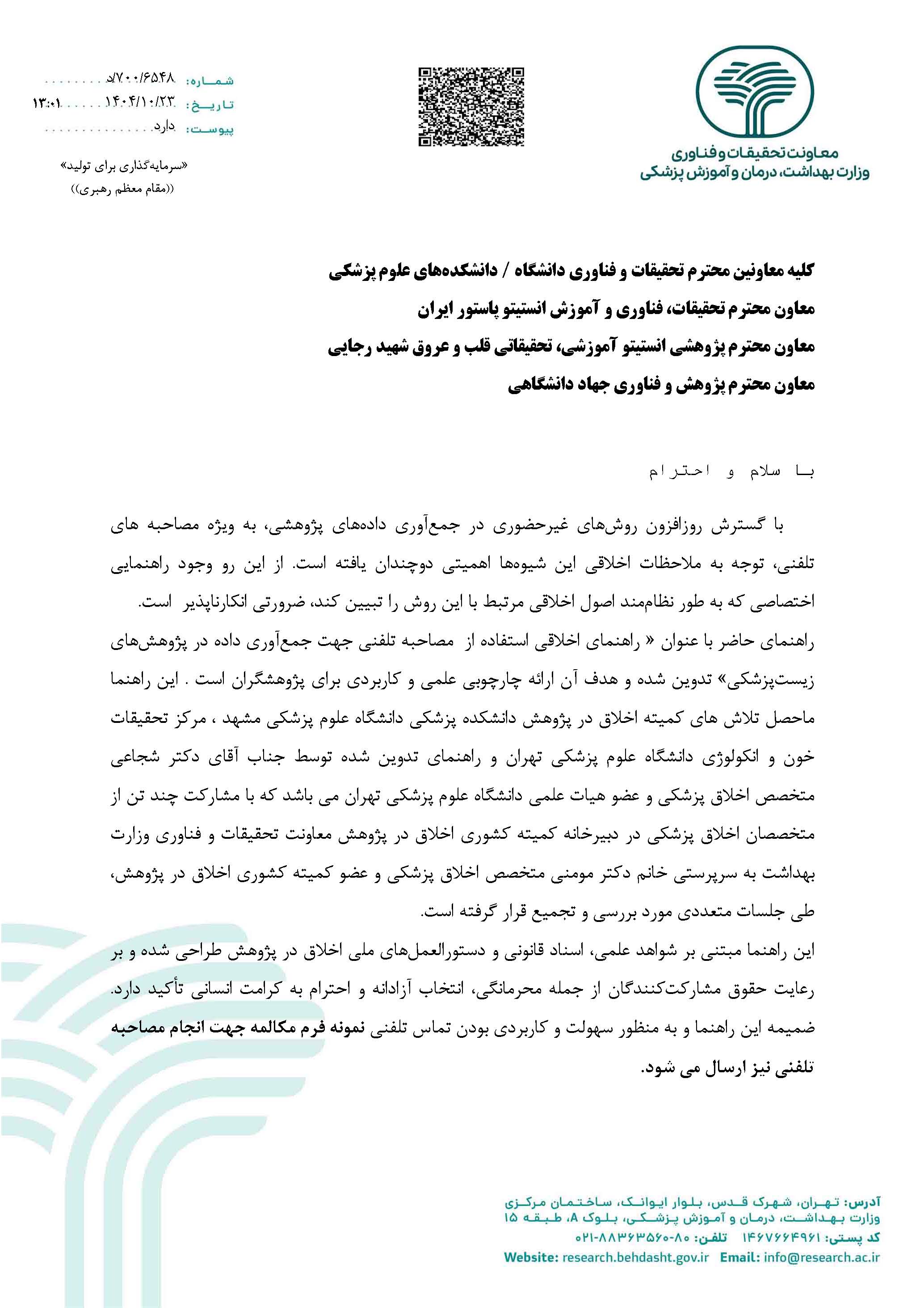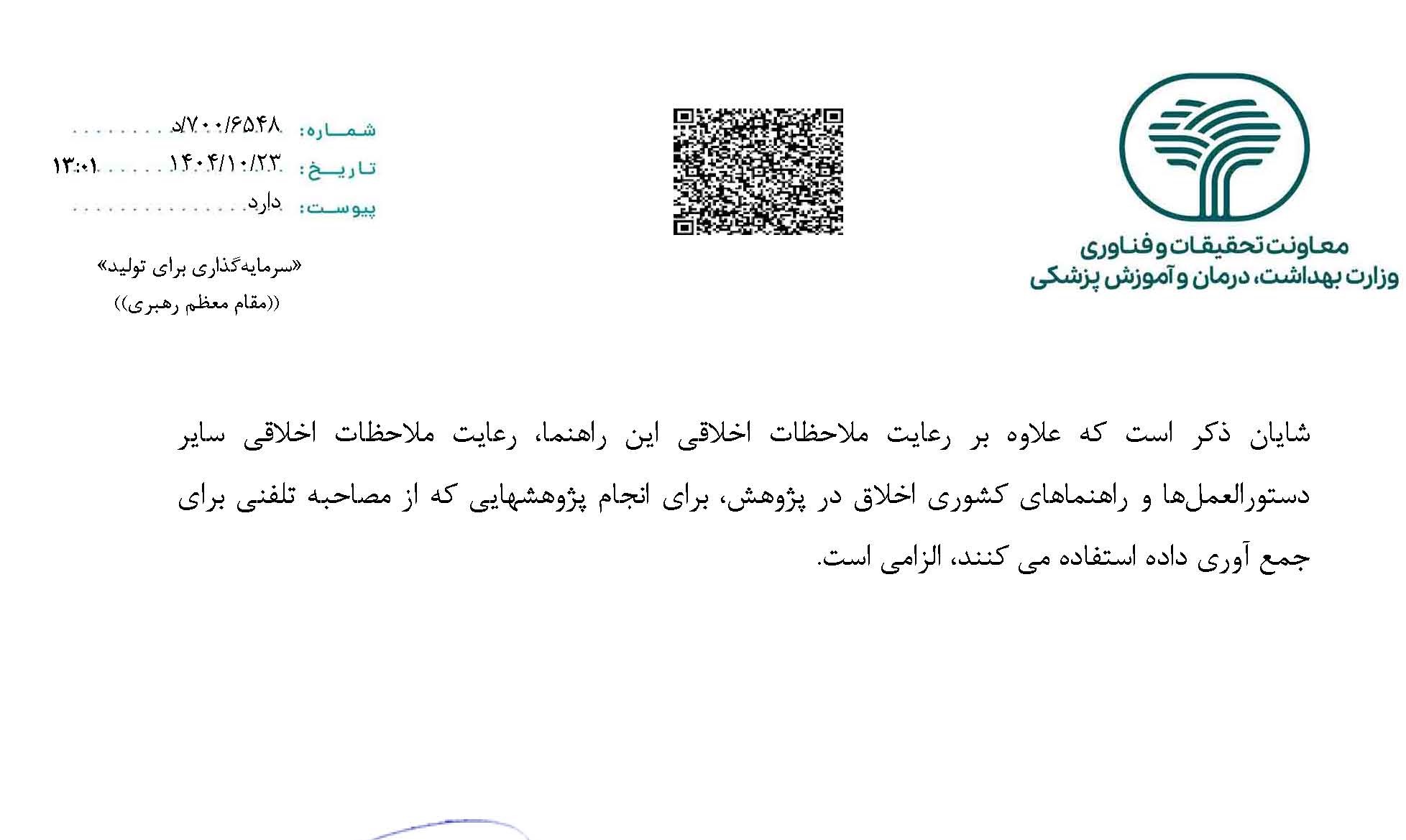 اطلاع رسانی راهنمای اخلاقی مصاحبه تلفنی جهت جمع آوری داده درپژوهش های زیست پزشکی
