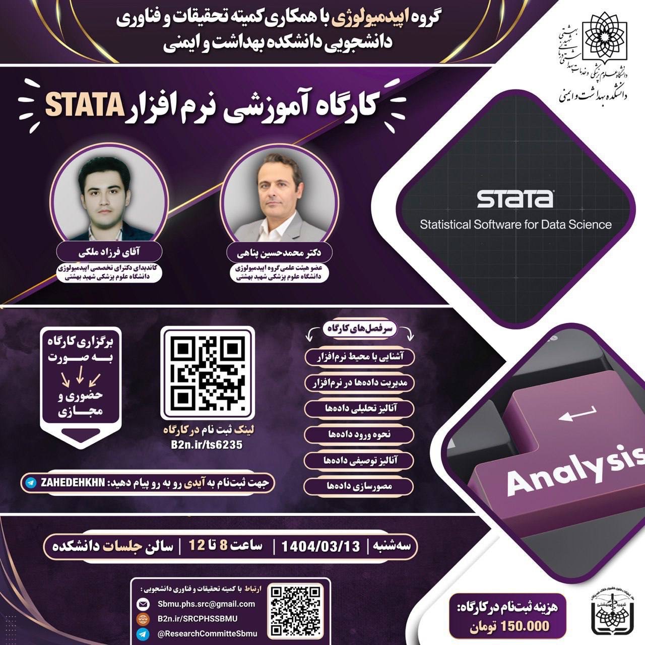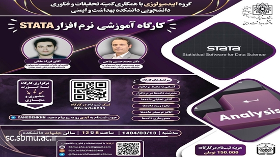 کمیته تحقیقات و فناوری دانشجویی دانشکده بهداشت و ایمنی دانشگاه با همکاری کمیته تحقیقات وفناوری دانشجویی دانشگاه علوم پزشکی شهید بهشتی و گروه اپیدمیولوژی دانشکده بهداشت و ایمنی، کارگاه آموزش نرم افزار STATAرا برگزار می نماید.