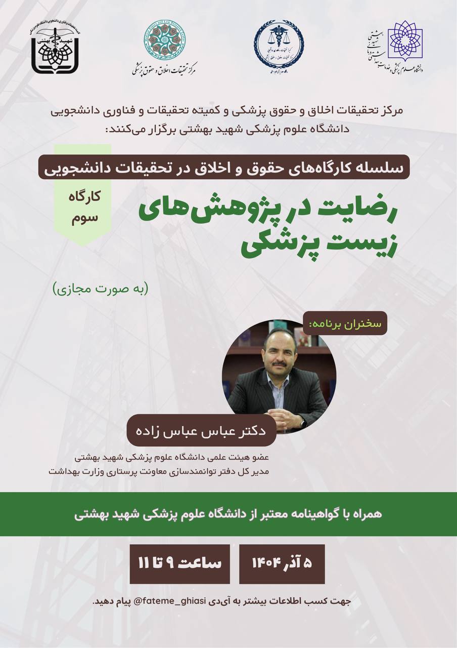 مرکز تحقیقات اخلاق و حقوق پزشکی دانشگاه علوم پزشکی شهید بهشتی با همکاری کمیته تحقیقات و فناوری دانشجویی دانشگاه برگزار می کند :