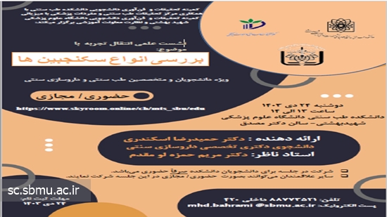کمیته تحقیقات و فناوری دانشکده طب سنتی در نظر دارد نشست انتقال تجربه با موضوع بررسی انواع سکنجبین ها را به صورت حضوری و مجازی، در روز دوشنبه 24 دی ماه در سالن دکتر مصدق دانشکده برگزار نماید. از علاقمندان جهت حضور در این نشست دعوت می شود جهت کسب اطلاعات بیشتر با شماره تلفن ذکر شده در پوستر تماس حاصل نمایند.