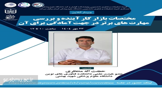 کمیته تحقیقات و فناوری دانشجویی پژوهشکده گوارش و کبد دانشگاه علوم پزشکی شهید بهشتی با همکاری کمیته تحقیقات و فناوری دانشگاه علوم پزشکی کرمان، در نظر دارد در مهرماه سال جاری اقدام به برگزاری "وبینار مختصات بازار کار آینده و بررسی مهارت های برتر در جهت آمادگی برای آن" در بستر اسکای روم نماید. مدرس این وبینار جناب آقای دکتر حجت اله منتظری، عضو محترم هیات علمی دانشکده فناوری های نوین پزشکی دانشگاه علوم پزشکی شهید بهشتی، می باشند.