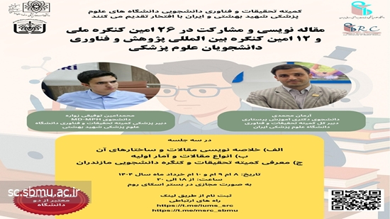 کمیته تحقیقات و فناوری دانشجویی دانشگاه علوم پزشکی شهید بهشتی با مشارکت کمیته تحقیقات و فناوری دانشجویی دانشگاه علوم پزشکی ایران برگزار می کند :